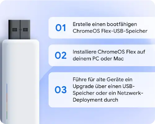 Bei einer geringeren Anzahl von Geräten können Sie diese mit einem USB-Installationsmedium für ChromeOS Flex starten, um ChromeOS Flex zu installieren. Alternativ können Sie es auch vorübergehend über das USB-Installationsprogramm ohne Installation ausprobieren.