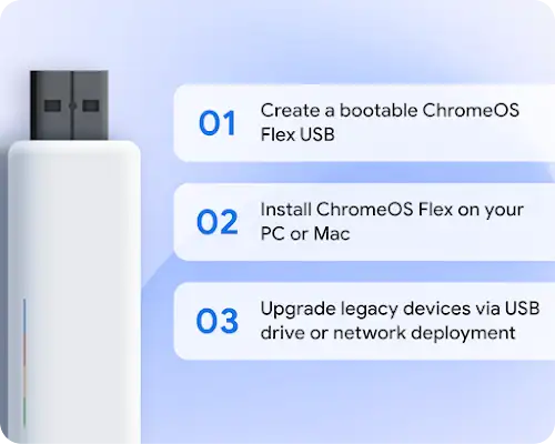 For fewer devices, boot them up with a ChromeOS Flex USB installer to install ChromeOS Flex. If you're not yet ready to install, you can temporarily run it using the USB installer to experience ChromeOS Flex with no commitment.