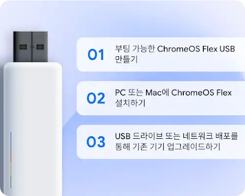 기기 수가 적은 경우 ChromeOS Flex USB 설치 프로그램으로 부팅하여 ChromeOS Flex를 설치하세요. 아직 설치할 준비가 되지 않았다면 USB 설치 프로그램으로 ChromeOS Flex를 임시로 실행해 약정 없이 사용해 보세요.