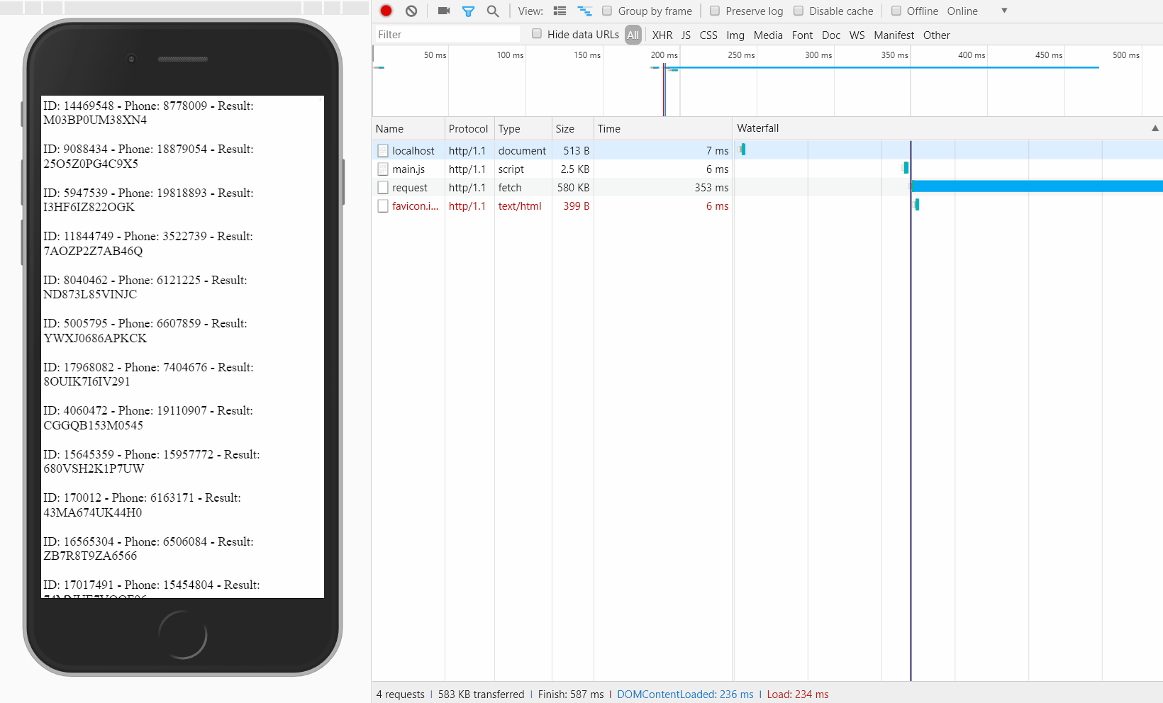 In the animation above, you can see that as I reload the page, the results are instantly displayed thanks to the streaming. Even though the rest of the HTTP request is still being downloaded and chunked, we are still able to process and display the results. Without streaming, we would have to wait the full 8 seconds for the file to download, and then display the results. This is much smoother!