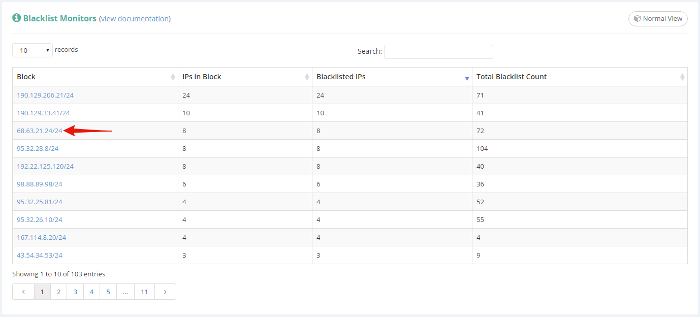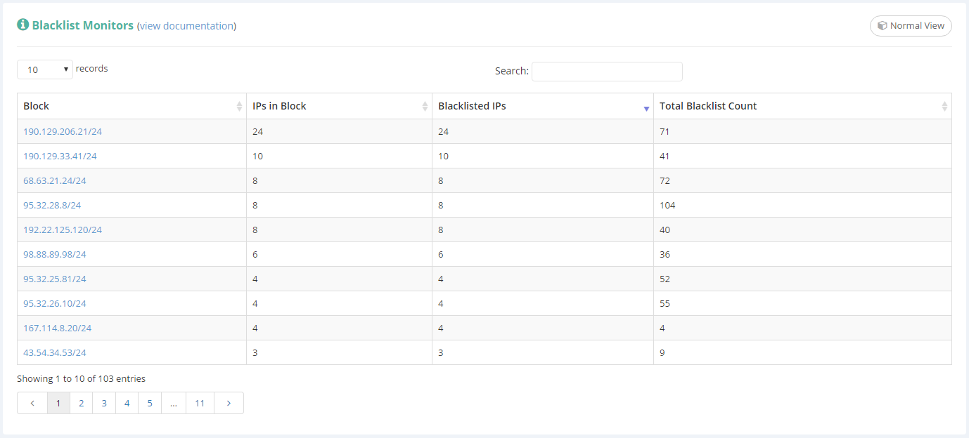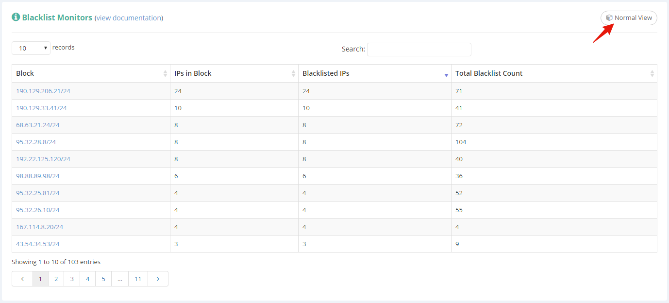 Clicking an IP block in the “Block” column will take you back to the Normal View, showing only the IPs in that /24 IP block.