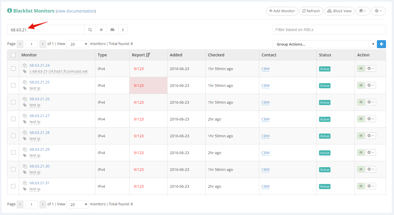 Block View allows you to view all of your IPv4 Blacklist Monitors, neatly grouped into /24 blocks. This way you can quickly find your most blacklisted blocks, or your cleanest blocks; and you can have a fast overview of the status of your IPv4 stock.
