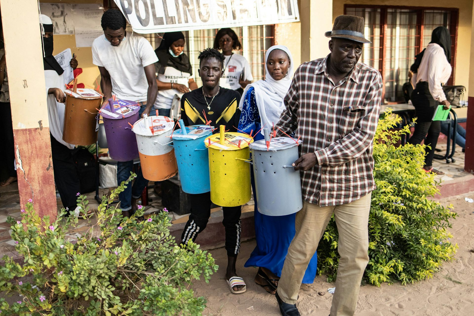 Election officials and volunteers carry drums of marbles representing votes, prior to the count in Banjul on 4 December 2021.