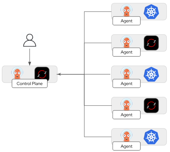 The disadvantage of this approach was that it could only scale so far. An organization with large fleets of clusters or application inventory would inevitably hit a point where Argo CD performance became problematic. Additionally, this model is a single point of failure (SPOF). If Argo CD is down, then the organization loses the ability to manage the entire fleet.