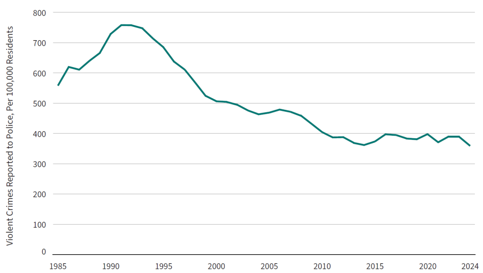 The COVID-19 pandemic contributed to a seismic increase in the most serious crime, homicide, which has fortunately declined to pre-pandemic levels. By 2024, homicide rates were 49% lower than their peak level in 1991. Violent and property crime rates overall have reached historic lows: 2024’s violent crime rate was 53% lower than its peak-1991 level and the property crime rate was 66% lower.6
