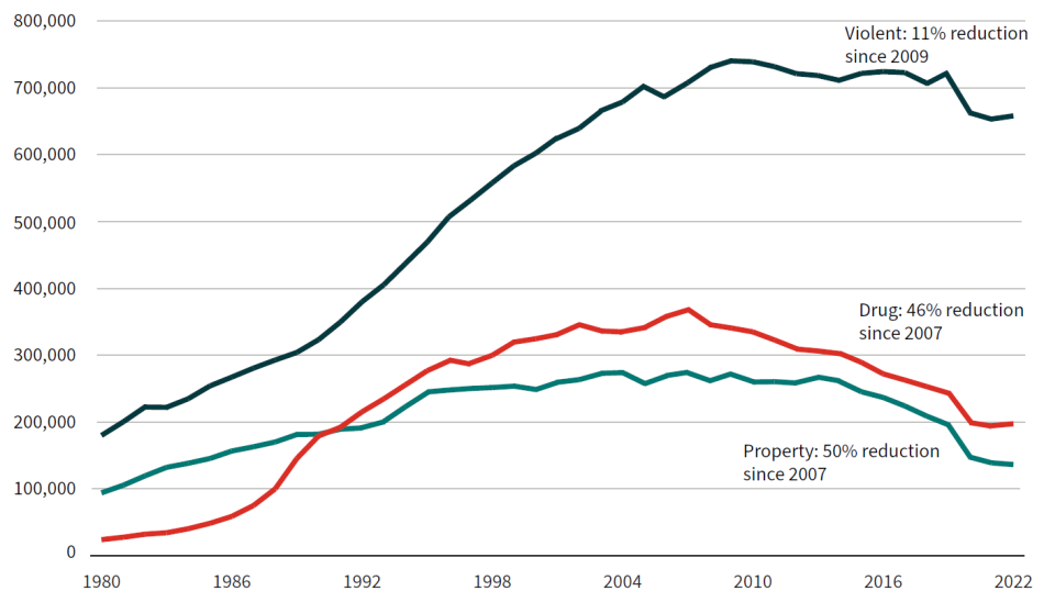 Between 1972 and 2009, the number of people imprisoned grew nearly 700%,2 while crime rates declined dramatically after peaking in 1991.3 Imprisonment levels slowly scaled back, achieving a 25% decline between 2009 and 2021.4 Then, the prison population has resumed its growth, according to the most recently available data. The prison population grew in 2022 and in 2023, 39 states increased their prison populations.5