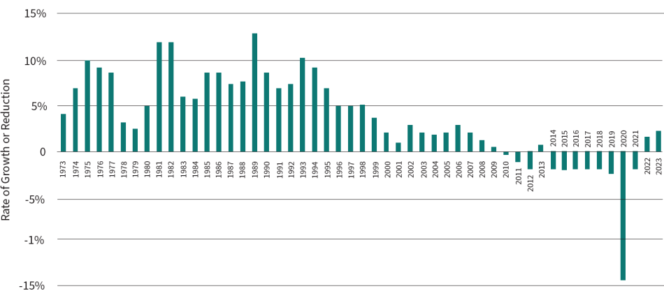 During the buildup of mass incarceration, between 1972 and 2009, the prison population grew an average of 5.8% annually. Since then, the pace of decarceration has been less than one third the rate of growth—averaging 1.7% each year, which includes an anomalous 14% drop in 2020 in response to the COVID-19 pandemic, and increases in the prison population in 2013, 2022, and 2023.10 The recent decarceration trajectory is tenuous given that the U.S. prison population grew by 4.0% between 2021 and 2023.11