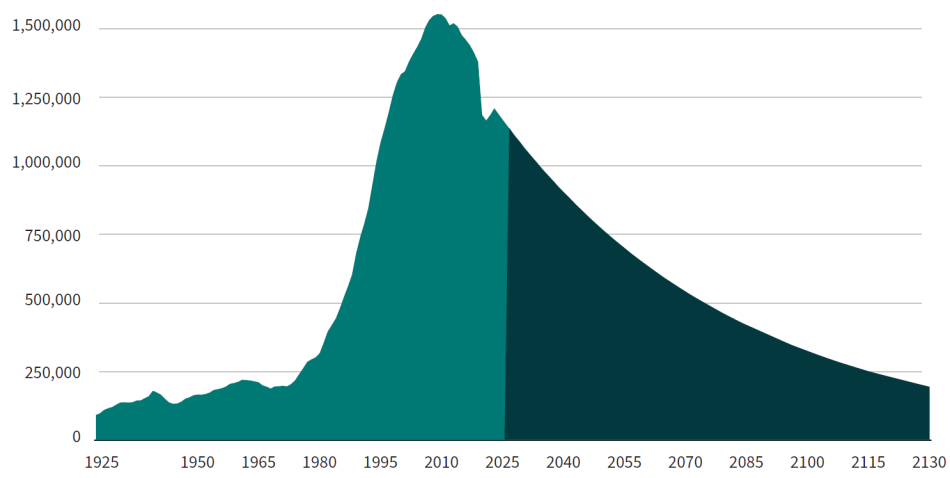 Source of historical figures: Bureau of Justice Statistics. (1982). Prisoners 1925-81; Bureau of Justice Statistics Corrections Statistical Analysis Tool; Mueller, D., & Kluckow, R. (2023). Prisoners in 2023–Statistical tables. Bureau of Justice Statistics.