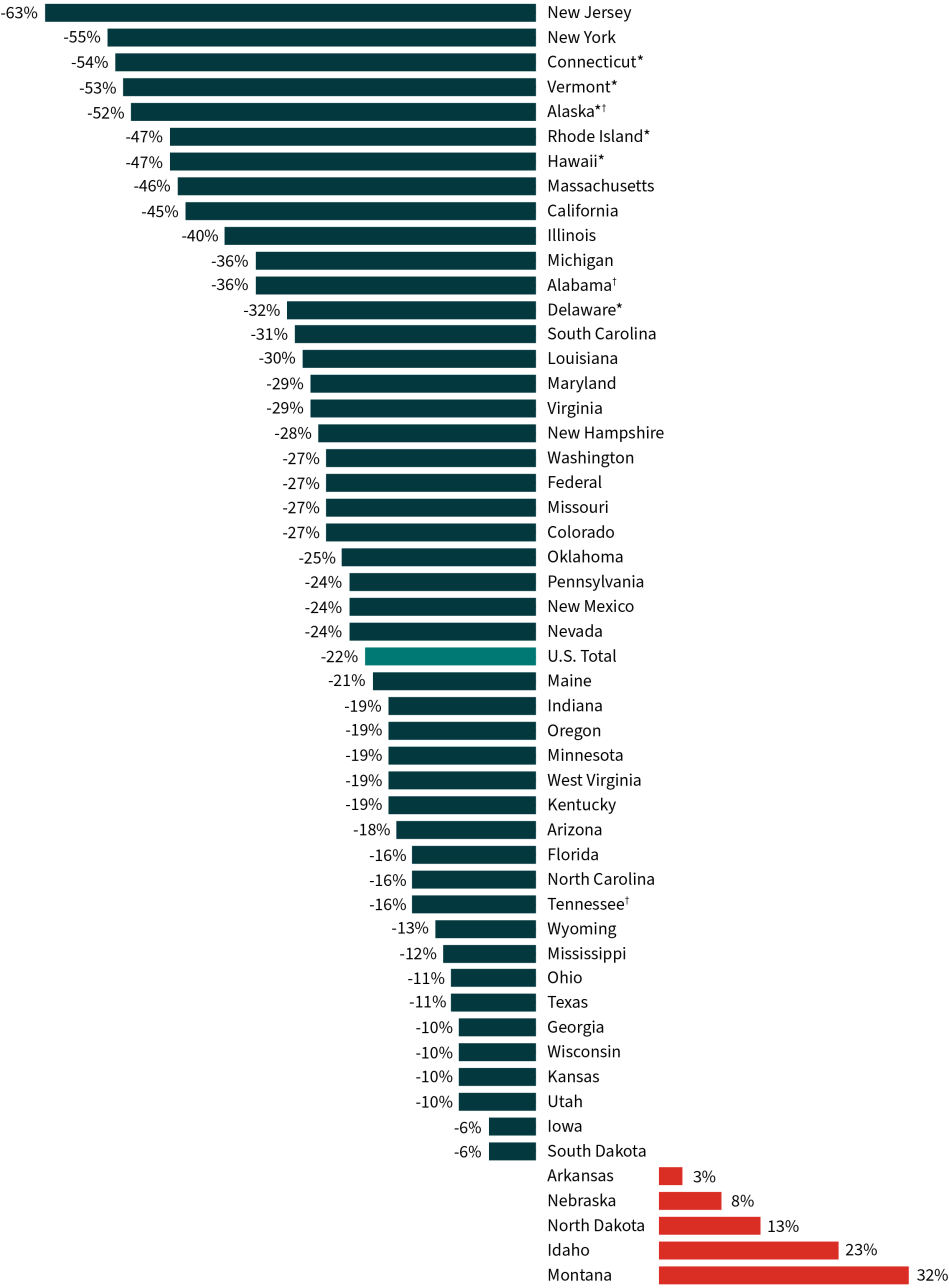 Given the dire consequences of mass incarceration and the breadth of evidence of its limited, and sometimes counterproductive, impact on public safety, the pace of decarceration has been far too slow in many states, and several jurisdictions have turned in the wrong direction. Ten states have reduced their prison populations by less than 15%.22 An additional five states reached their peak level of imprisonment in 2023: Arkansas, Idaho, Montana, Nebraska, and North Dakota.