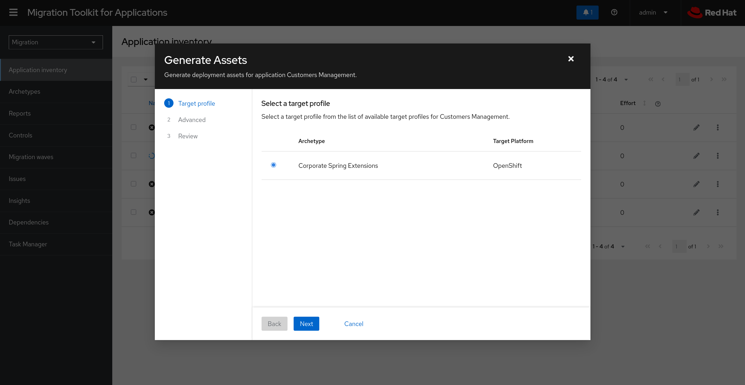 The MTA provides a central management interface that gives you a flexible, comprehensive view of your application portfolio, enabling you to evaluate its current state. To help you choose which applications to containerize and update with cloud-native technology, you can create application archetypes, which automatically group applications based on the criteria you define. You can also perform bulk assessment and automated source-code analysis to get both high-level and low-level insights that inform your modernization strategy and execution.